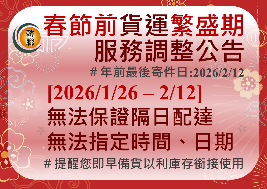 首頁 ﹥ 最新消息 > 公告 > - 農曆春節前貨運繁盛期服務調整公告 - 2026-01-14 因應農曆春節前貨運繁盛期配送服務調整公告 2026/1/26 - 2/12期間出貨包裹無法保證隔日配達無法指定時間無法指定日期2026/2/12為過年前最後出貨日建議您即早備貨以利庫存銜接使用 韓聯預祝您春年佳節愉快馬車載福氣,金銀滿倉來 回列表